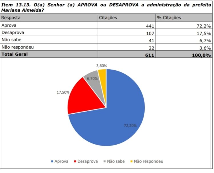 A prefeita de Pau dos Ferros Marianna Almeida (PSD) tem uma provação de 72,2%. Os números são do Instituto Sensatus.