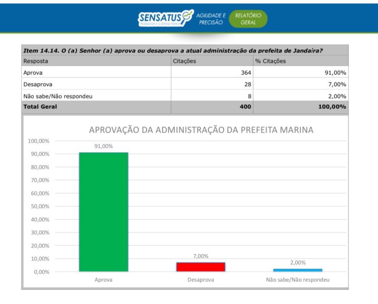 A prefeita Marina Marinho (PT) segue em alta com o eleitorado de Jandaíra. Ela é a prefeita mais bem avaliada do Rio Grande do Norte e a pesquisa Sensatus/Blog do Barreto mostra ela com 91% de aprovação.