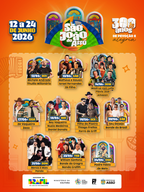 “São três séculos de fé, tradição e identidade do nosso povo. Temos o orgulho de realizar o São João mais antigo do mundo, uma herança viva que pertence a cada assuense. Nossa festa vai além dos palcos: ela é feita pelos artistas da terra, pela força da nossa cultura e pelo nosso povo”, destacou o prefeito Lula Soares.