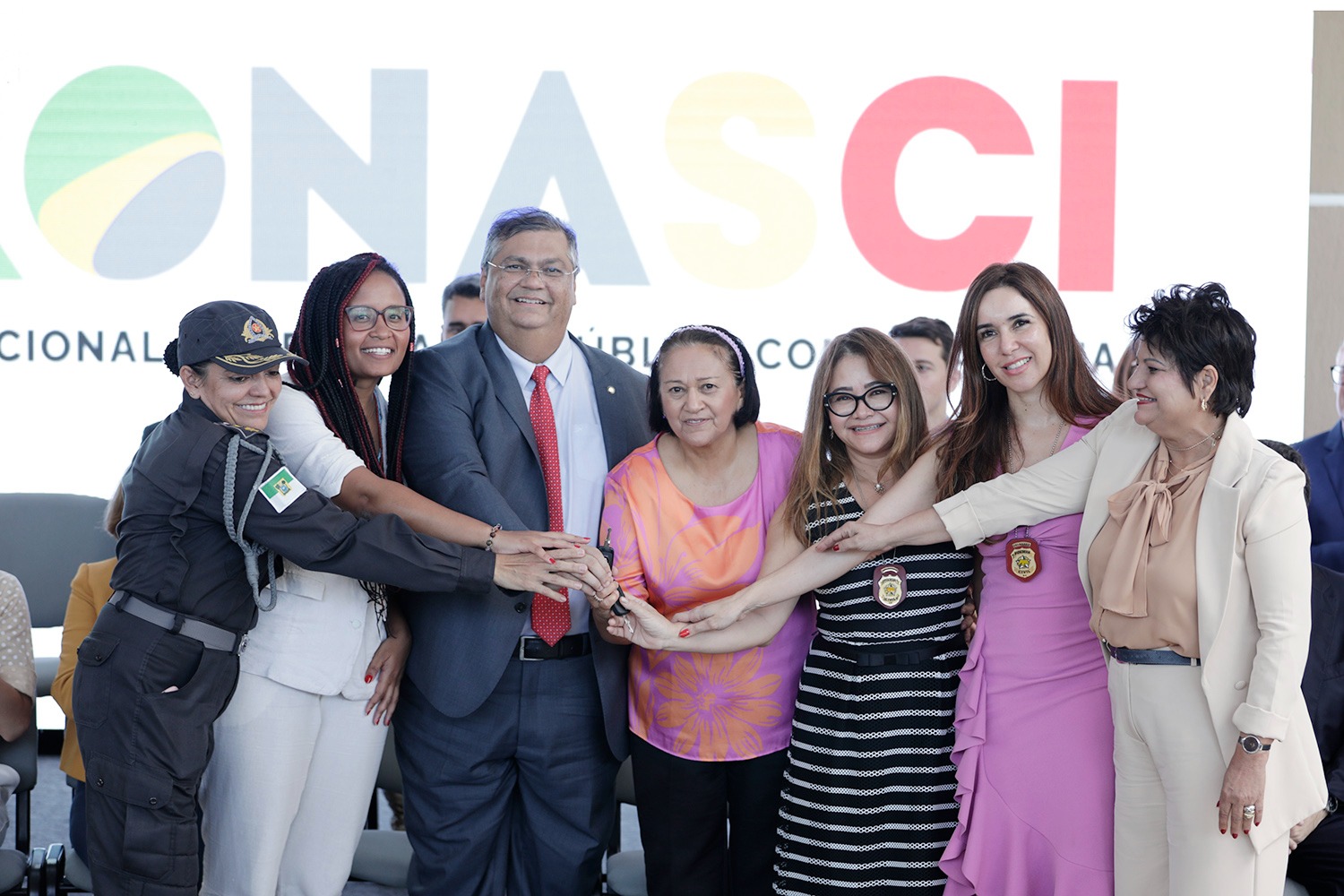Pelas forças de segurança do RN: Coronel Francisco Araújo, secretário de Estado da Segurança Pública; Helton Xavier, secretário de Estado da Administração Penitenciária; Ana Cláudia Saraiva, delegada geral da Polícia Civil; Coronel Alarico Azevedo, comandante geral da Polícia Militar; Coronel Monteiro, comandante geral do Corpo de Bombeiros Militar; Marco Brandão, diretor geral do ITEP; Paoula Maués, diretora do Departamento de Proteção a Grupos em Situação de Vulnerabilidade; tenente coronel Soraia Castelo Branco, coordenadora da Patrulha Maria da Penha no RN, e Sheila Freitas, secretária municipal de Segurança Pública e Defesa Social, representando o prefeito de Natal.