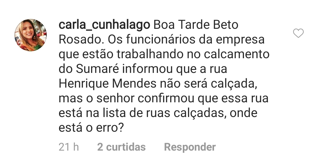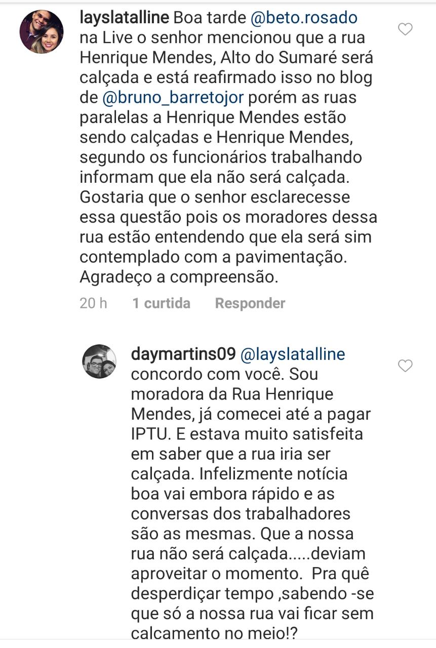 A moradora Laysla Talline cita matéria publicada pelo Blog do Barreto para reforçar que a rua foi uma das eleitas na enquete feita pelo deputado. “Boa tarde @beto.rosado na Live o senhor mencionou que a rua Henrique Mendes, Alto do Sumaré será calçada e está reafirmado isso no blog de @bruno_barretojor porém as ruas paralelas a Henrique Mendes estão sendo calçadas e Henrique Mendes, segundo os funcionários trabalhando informam que ela não será calçada. Gostaria que o senhor esclarecesse essa questão pois os moradores dessa rua estão entendendo que ela será sim contemplado com a pavimentação. Agradeço a compreensão”, frisou.