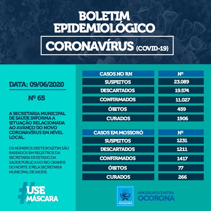 O número de casos confirmados de Covid-19 chegou a 1.417 em Mossoró. O Município registra 77 óbitos com confirmação da doença, segundo boletim epidemiológico divulgado pela Secretária da Saúde Pública do Rio Grande do Norte (SESAP-RN), nesta terça-feira, 9, confirmado pela Prefeitura de Mossoró.