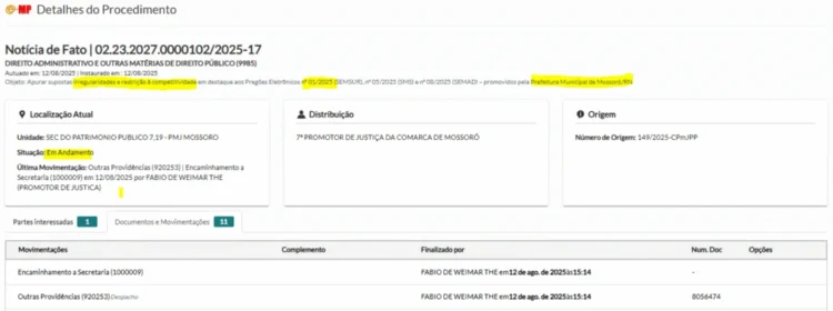 O Ministério Público do Rio Grande do Norte instaurou, nesta terça-feira (12), uma nova Notícia de Fato contra a Prefeitura de Mossoró, sob gestão Allyson Bezerra (União Brasil), para apurar possíveis irregularidades em processos licitatórios realizados pela administração municipal. O procedimento, registrado sob o nº 02.23.2027.0000102/2025-17, tramita na 7ª Promotoria de Justiça da Comarca de Mossoró e investiga indícios de restrição à competitividade nos Pregões Eletrônicos nº 01/2025 (Educação), nº 05/2025 (Saúde) e nº 08/2025 (Administração), realizados por secretarias da Prefeitura.