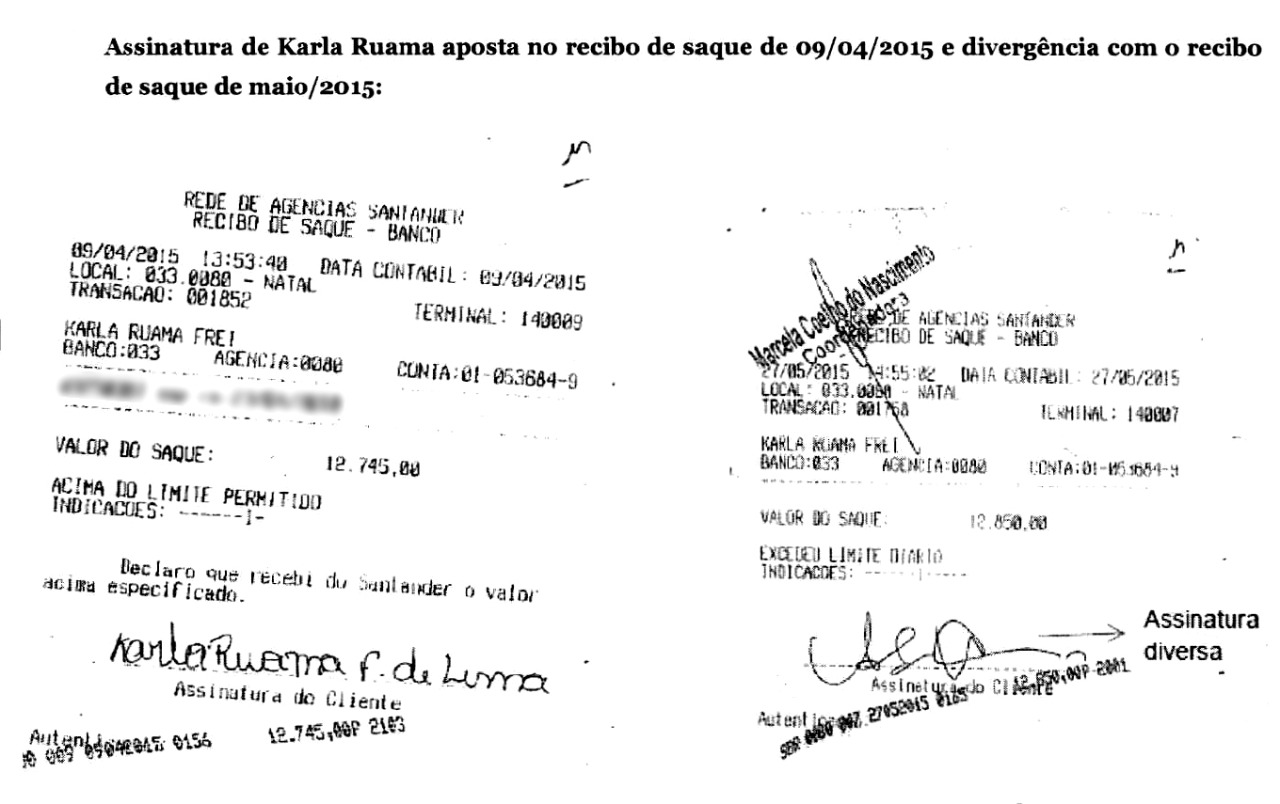 No mês de junho de 2015, houve saques com assinaturas de uma outra pessoa nas contas dos investigados Karla Ruama Freire de Lima, Jalmir de Souza Silva, Fabiana Carla Bernadino da Silva e Ivaniecia Varela Lopes, todos ex-assessores técnicos da Presidência da Assembleia presos na operação Canastra Real. “Mais uma vez, os padrões das assinaturas dos investigados nesse mês guardam muita semelhança entre si, e divergem consideravelmente dos originais”, cita trecho da decisão judicial. Em depoimento ao MPRN, três deles confirmaram que as assinaturas que estão nos recibos bancários não são deles.