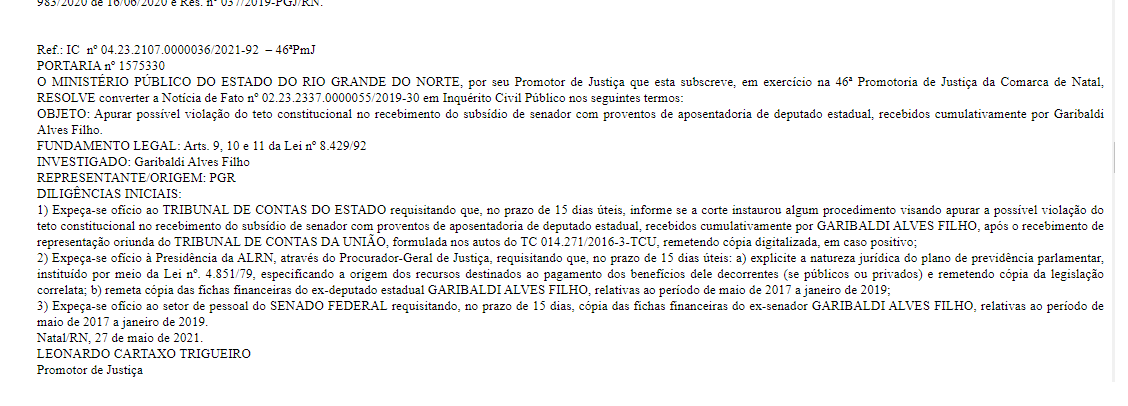 O Ministério Público Rio Grande do Norte (MPRN), divulgou na edição de hoje (19) do Diário Oficial do Estado que está apurando possível violação do teto constitucional pelo então Senador, Garibaldi Alves Filho (MDB), que estaria acumulando aposentadoria de Deputado Estadual ao salário de Senador durante o período de 2017 a 2019.