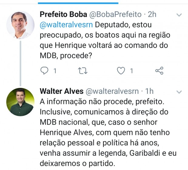 Provocado pelo prefeito de Coronel Ezequiel “Boba”, o deputado federal a se posicionar no Twitter a respeito da possibilidade de o ex-ministro Henrique Alves Assumir o comando do MDB no Rio Grande do Norte. O assunto veio à torna jornalisticamente através da jornalista Thaísa Galvão.