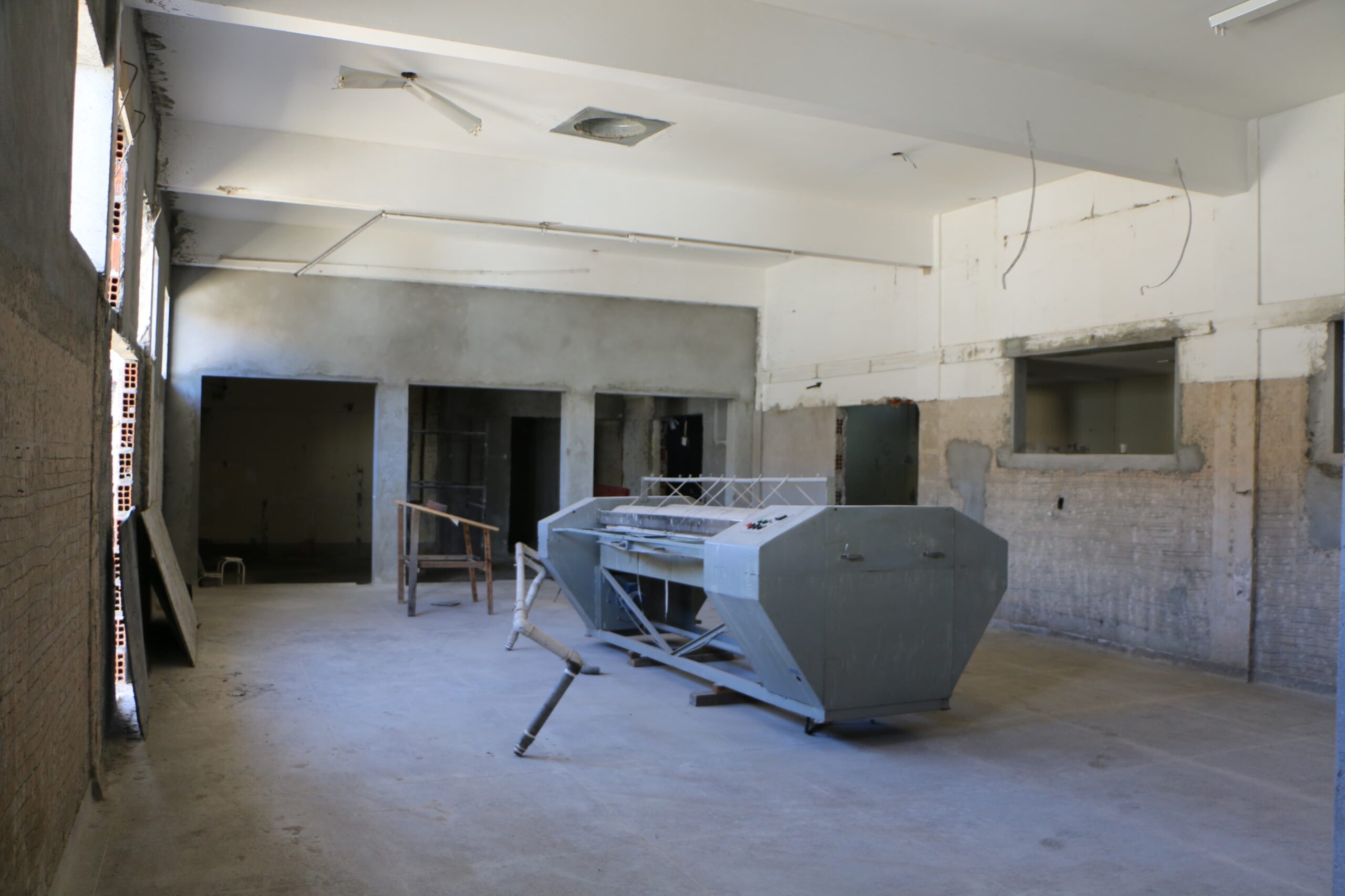 No bloco da lavanderia foi concluído o emboço da área dos banheiros. As antigas tubulações de água fria foram retiradas e já foi iniciada a nova marcação e instalação. As instalações elétricas também estão em fase de execução, com rasgos, chumbamento de eletrodutos e caixas.