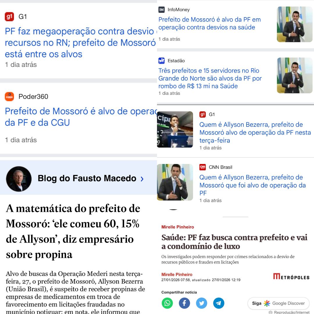 • Folha de S. Paulo: O jornal foca na pressão institucional sobre o União Brasil. Allyson Bezerra, visto até ontem como um “gestor modelo” e nome forte para o Governo do RN em 2026, agora é monitorado pela cúpula nacional do partido, que teme o desgaste da imagem da legenda no Nordeste.