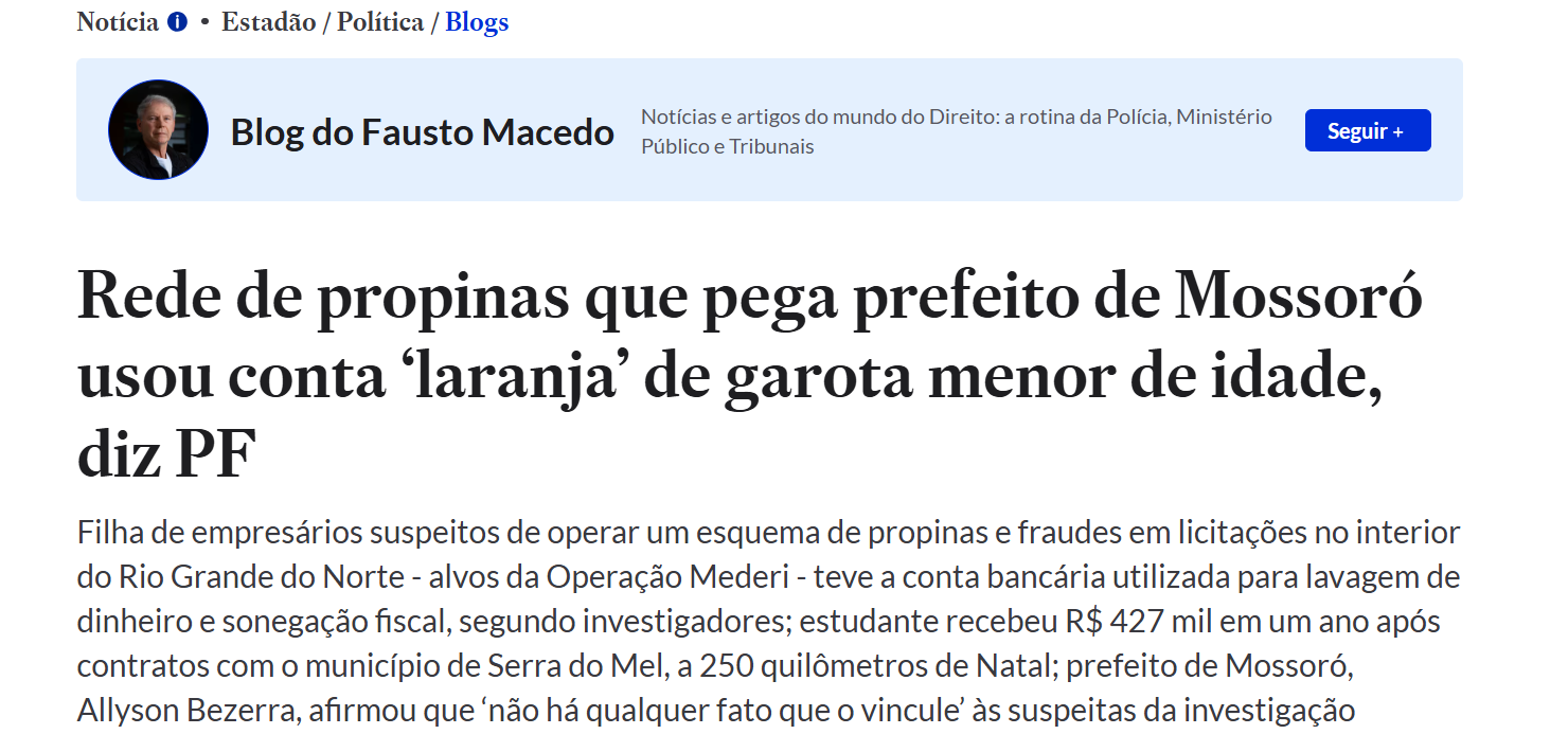 O cenário político do Rio Grande do Norte voltou a ser destaque na mídia nacional nesta segunda-feira. O Blog de Fausto Macedo, do Estadão, trouxe informações da Polícia Federal (PF) que detalham como a rede de propinas investigada na Operação Mederi, que envolve o prefeito de Mossoró e pré-candidato ao governo estadual, Allyson Bezerra (UB), utilizava métodos sofisticados para ocultar dinheiro público.