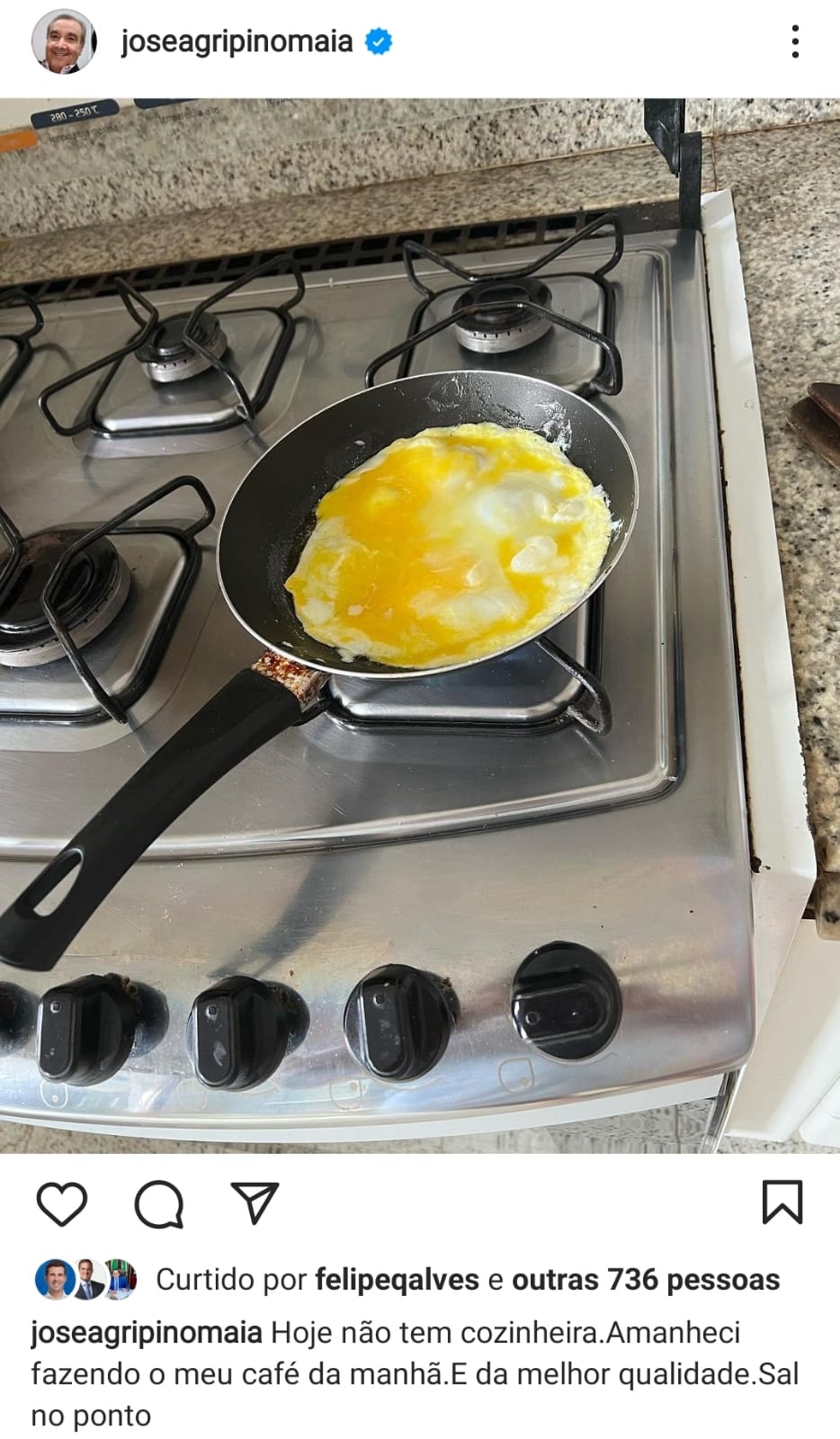 No final de semana o ex-senador José Agripino (UB) disse que estava sem cozinheira e foi ele mesmo fritar o ovo do café da manhã.