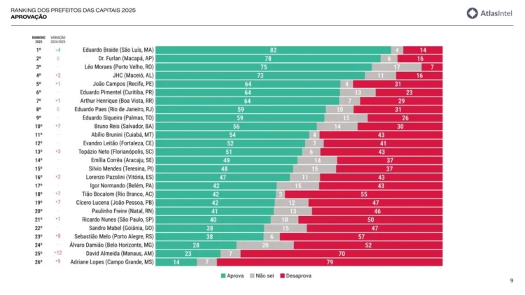 O prefeito de Natal, Paulinho Freire (União Brasil), figura entre os gestores de capitais com avaliação bem abaixo da média nacional, de acordo com o ranking de aprovação dos prefeitos de capitais divulgado pela AtlasIntel hoje (19). O levantamento, abrangendo mais de 82 mil entrevistas em todas as capitais brasileiras, mostra que a gestão de Freire registrou 41% de aprovação, posicionando-o na 20ª colocação entre 26 capitais avaliadas, ou seja, entre os prefeitos menos bem aprovados do país.