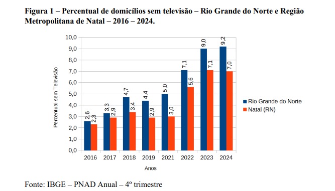 Entre 2016 e 2024, o percentual de domicílios sem televisão aumentou gradativamente no Rio Grande do Norte e na Região Metropolitana de Natal (RM de Natal). Os números são da Pesquisa Nacional por Amostra de Domicílios Contínua (PNAD Contínua) – Tecnologia da Informação e Comunicação (TIC).