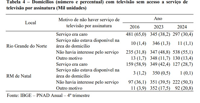 Conforme observado na Tabela 4, o principal motivo para a ausência de TV por assinatura em 2024 foi a falta de interesse pelo serviço, superando o custo elevado que liderava em 2016. No Rio Grande do Norte, 55,1% dos domicílios alegaram desinteresse, enquanto apenas 30,4% mencionaram o preço. Na Região Metropolitana de Natal, essa inversão também foi observada: o desinteresse atingiu 50,3%, contra 28,7% por custo.