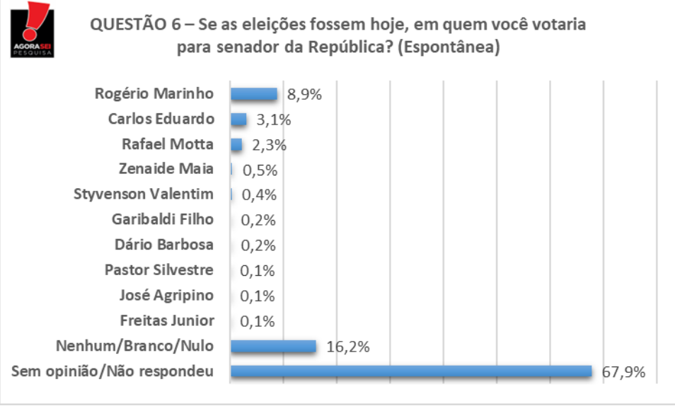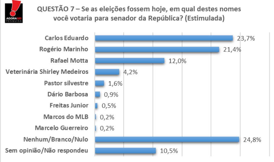 O ex-prefeito do Natal Carlos Eduardo Alves (PDT) caiu 2,6 pontos percentuais em relação a última pesquisa AgoraSei, divulgada em maio. Já o ex-senador Rogério Marinho (PL) subiu 2,5 e está tecnicamente empatado com o pedetista na disputa pelo Senado.