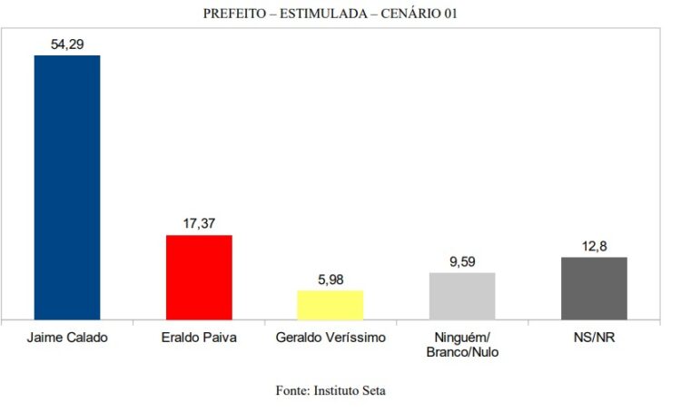 No cenário estimulado para Prefeitura, o ex-prefeito Jaime Calado lidera com 54,2% contra 17,3% do atual prefeito Eraldo e 5,9% de Geraldo Veríssimo. 9,5% votariam branco ou nulo e 12,8% não responderam.