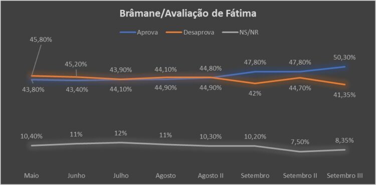 A gestão da governadora Fátima Bezerra teve avaliação positiva de 50,3%, o que representa uma alta de 2,5 pontos percentuais desde a última pesquisa. A desaprovação foi de 41,35% registrando uma queda de 3,35 pontos percentuais. 8,35% dos entrevistas não soube ou não respondeu.