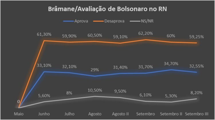 O Instituto de pesquisa Brâmane, em parceria com o Blog do BG, divulgou hoje (29)uma pesquisa de opinião para compreender o comportamento do eleitorado potiguar às vésperas da eleição. Dentre os pontos levantados, foi perguntado aos entrevistados e entrevistadas a aprovação sobre os governos de Fátima Bezerra e Jair Bolsonaro.