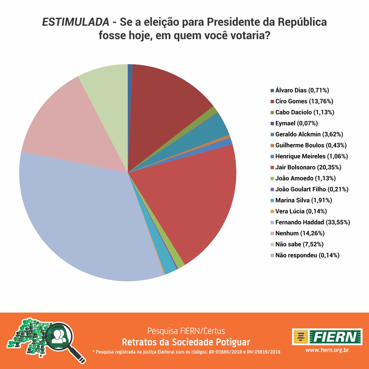 A pesquisa do Instituto Certus mostrou que o candidato a presidente da República Fernando Haddad tem 33,55% de intenções de voto no Rio Grande do Norte. Em segundo lugar se encontra o líder das pesquisas em nível nacional Jair Bolsonaro (PSL) com 20,35%.