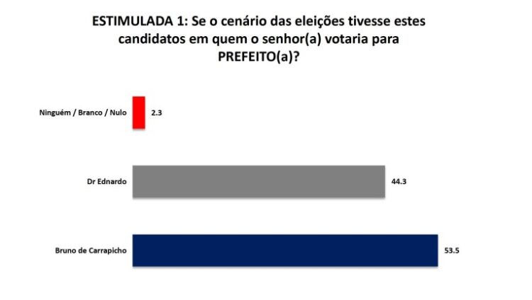 Na pesquisa estimulada, Bruno de Carrapicho lidera com 53,5% das intenções de voto, contra 44,3% do candidato da situação, Dr. Ednardo. 2,3% disseram que votariam branco ou nulo.