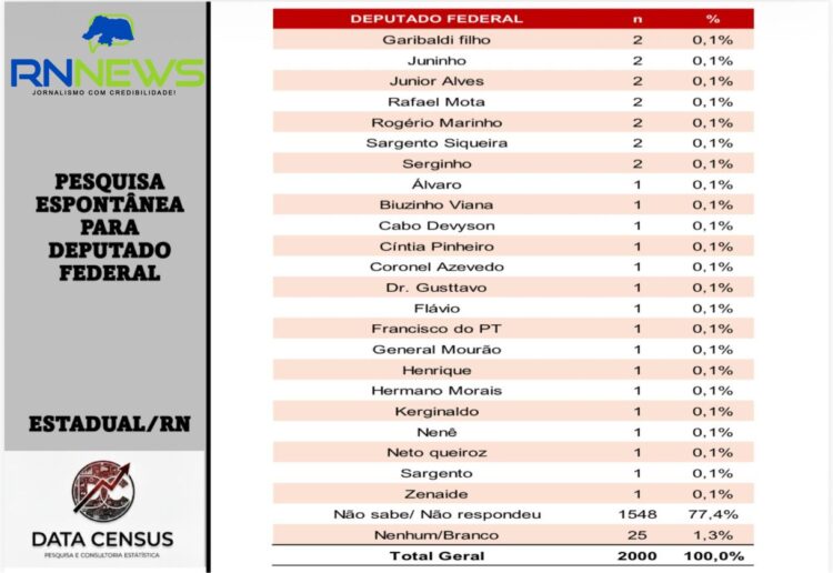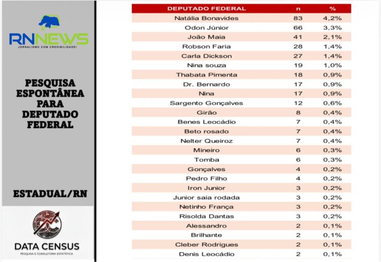 A deputada federal Natália Bonavides (PT) e o ex-prefeito de Currais Novos Odon Junior (PT) foram os nomes mais citados na pesquisa de deputado federal do Instituto Data Census divulgada pelo portal RN News.