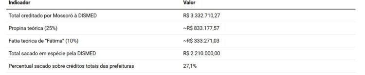 Aplicando o percentual de 25% mencionado nas escutas, o valor teórico de propina apenas para Mossoró seria de aproximadamente R$ 833 mil. Desse montante, os 10% atribuídos a “Fátima” representariam algo em torno de R$ 333 mil.