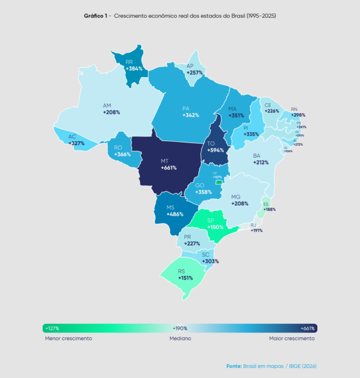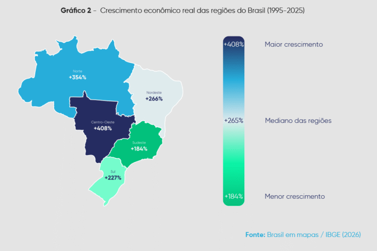 Os dados integram levantamento divulgado pelo Brasil em Mapas, que analisa a evolução da atividade econômica nas regiões brasileiras. O estudo aponta que o Nordeste registrou o terceiro maior crescimento real do PIB entre as regiões do país, ficando atrás apenas do Centro-Oeste e do Norte, como apontado no gráfico 3: