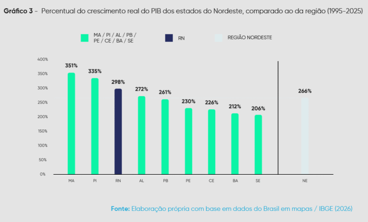 No mesmo intervalo, o PIB real do Brasil cresceu 222%, evidenciando que a economia potiguar avançou em ritmo mais acelerado que o do país.
