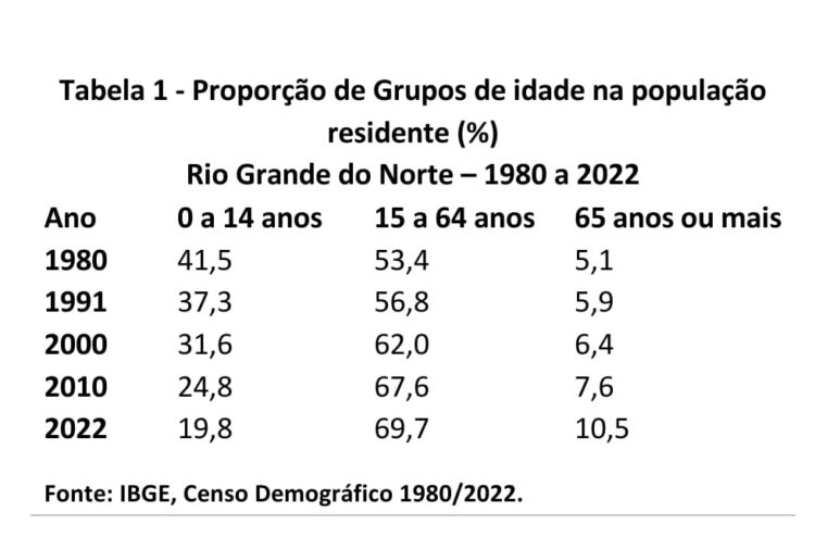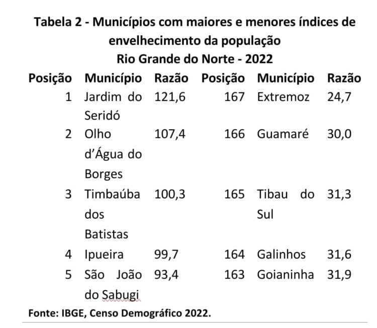 O índice de envelhecimento mostra a relação de idosos de 65 anos ou mais de idade em relação à população que tem entre 0 e 14 anos. Quanto maior o valor do indicador, mais envelhecida é a população. Esse índice chegou a 53,0 em 2022 para o Rio Grande do Norte, indicando haver 53 idosos para cada 100 crianças. Em 2010 esse índice era de 30,4, indicando um processo de envelhecimento da população. O Município com o maior índice de envelhecimento no estado é Jardim do Seridó (121,6), enquanto Extremoz teve o menor índice de envelhecimento (24,7) [Tabela 2].