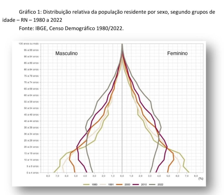 Entre 1980 e 2022, observa-se o alargamento do topo e o estreitamento da base da estrutura etária da população residente no Rio Grande do Norte, demonstrando uma tendência de envelhecimento da população, sobretudo da feminina.