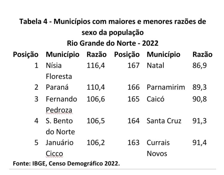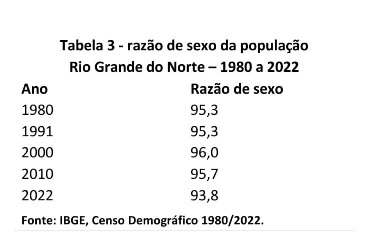 O Censo Demográfico 2022 mostrou, para o Rio Grande do Norte, uma razão de sexo igual a 93,8, indicando haver 93,8 homens para cada 100 mulheres [Tabela 3]. Devido ao envelhecimento demográfico, é esperado que o número de homens seja gradualmente menor que o número total de mulheres, já que essas apresentam, na média, menor mortalidade durante todas as etapas da vida.