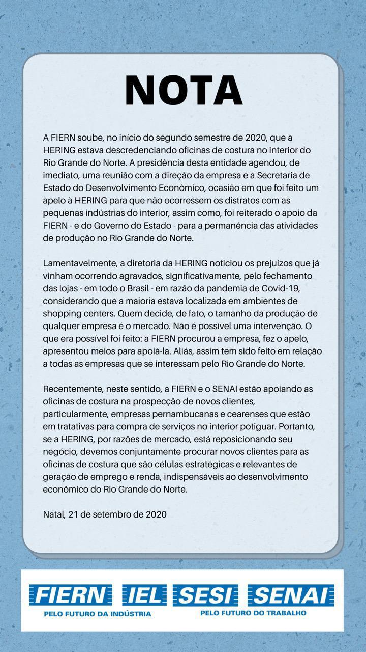 Hoje a Federação das Indústrias do Rio Grande do Norte (FIERN) divulgou nota explicando que a saída da empresa se deu por um reposicionamento do mercado e se comprometendo em atrair novos clientes para as oficinas de costura do interior potiguar.