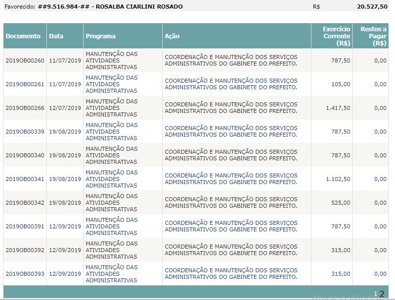 No acumulado entre 1º de janeiro e 12 de setembro de 2019 ela recebeu R$ 20.527,50.