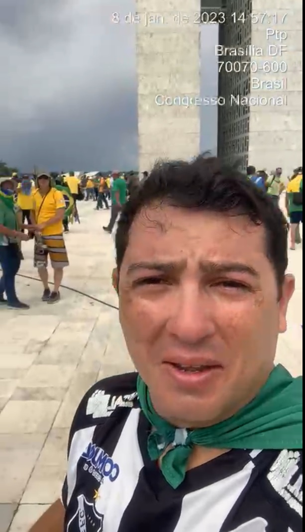 Em vídeo selfie, com roupa do time e camisa do Brasil amarrada ao pescoço, diz: “Spray de pimenta queima, pessoal, queima de verdade. Perdi meu óculos, mas tamo aqui, ó, representando vocês patriotas que não podem estar aqui. Brasil é nosso”.