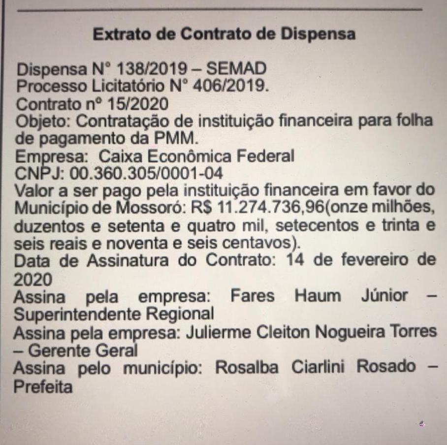 Foi publicado na edição de 14 de fevereiro do Jornal Oficial de Mossoró o extrato do contrato da venda folha de pagamento da Prefeitura de Mossoró para a Caixa Econômica Federal.