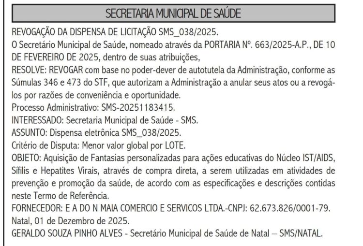A Secretaria Municipal de Saúde de Natal esclarece que, conforme publicado no Diário Oficial de 02 de dezembro de 2025, o processo de Aquisição de Fantasias personalizadas para ações educativas do Núcleo IST/AIDS, Sífilis e Hepatites Virais, foi revogado e, em seguida, arquivado.