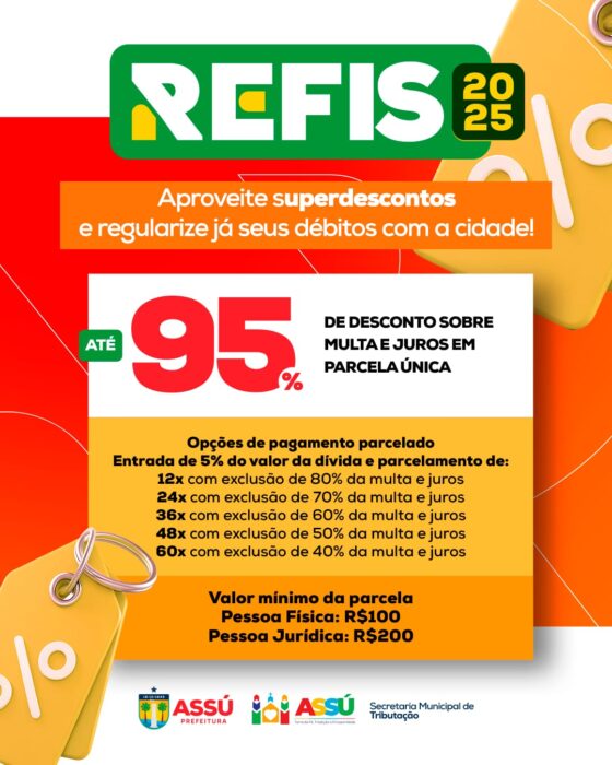 A Prefeitura do Assú, por meio da Secretaria Municipal de Tributação, deu início ao Refis Assú 2025, um programa de regularização fiscal que oferece condições especiais para que contribuintes assuenses possam quitar seus débitos com o município com até 95% de desconto em multas e juros.