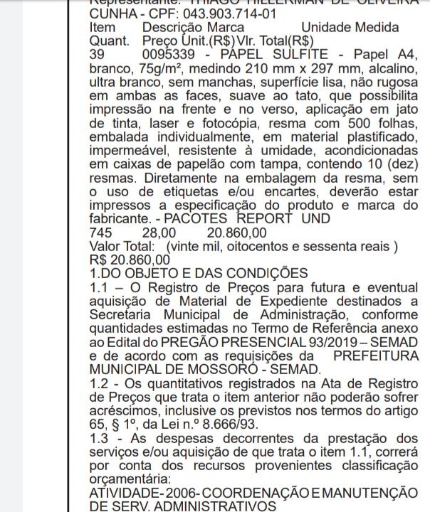 Está no Jornal Oficial de Mossoró (JOM) o pregão pregão presencial N°. 93/2019 – SEMAD/ata Nº 127/2019 de registro de preço para a aquisição de 745 resmas de papel A4 da marca Report. O contrato previsto é para um período de 12 meses.