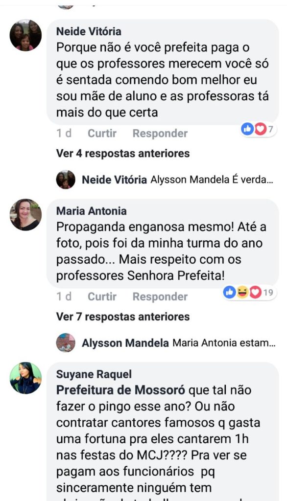 No entanto a foto é antiga como deixa claro a professora Maria Antônia em comentário na postagem da página da Prefeitura de Mossoró no Facebook. “Propaganda enganosa mesmo! Até a foto, pois foi da minha turma do ano passado… Mais respeito com os professores Senhora Prefeita!”, frisou.