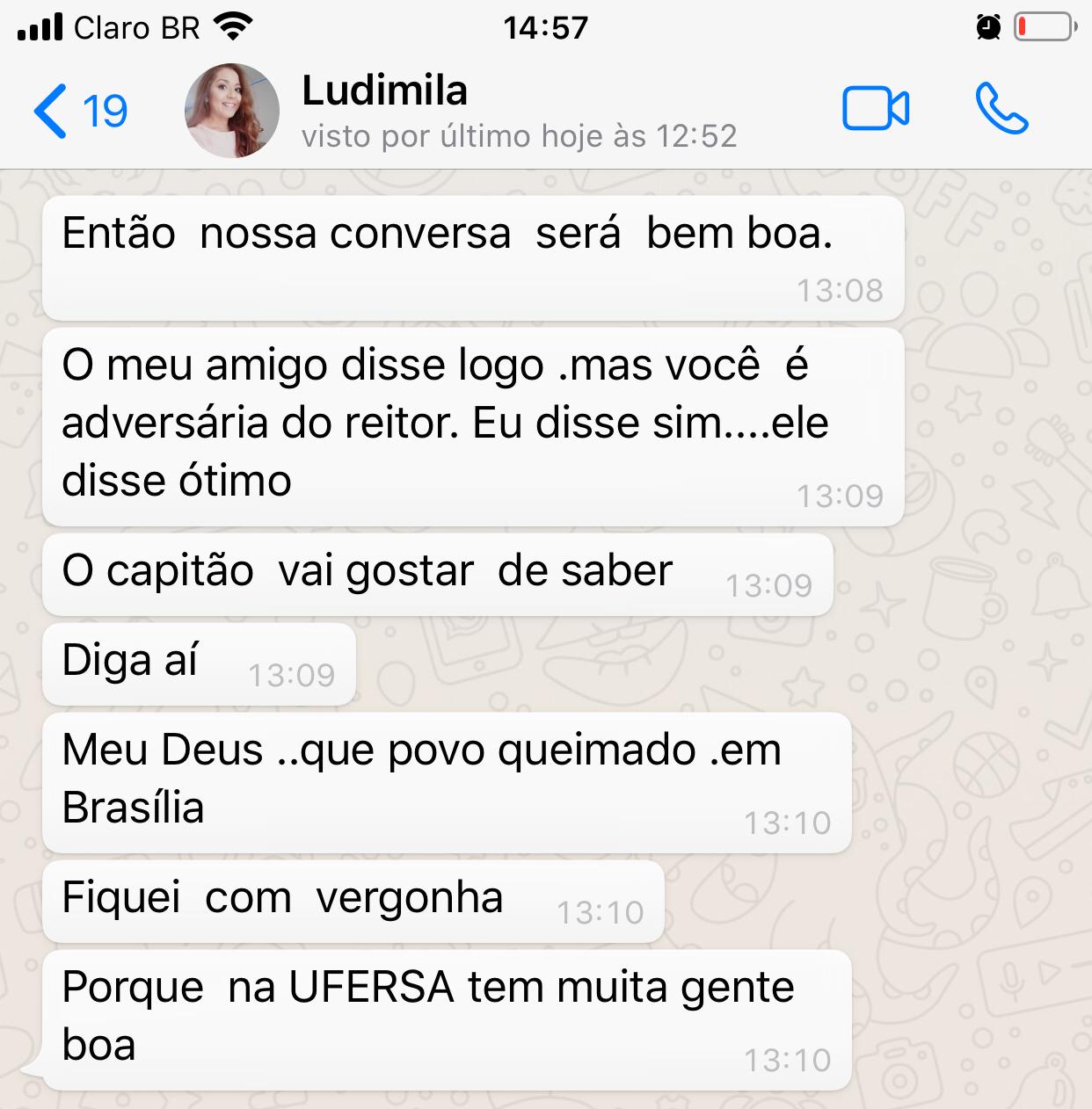 Ainda assim, Ludimilla sabia conforme o print abaixo demonstra que a receita para se tornar reitora seria ser adversária do reitor Arimatéia Matos, que já teve ligações com o PT, e não ter filiação partidária. “O capitão vai gostar de saber”, diz uma em uma das frases da conversa atribuída a um interlocutor com trânsito no Palácio do Planalto.