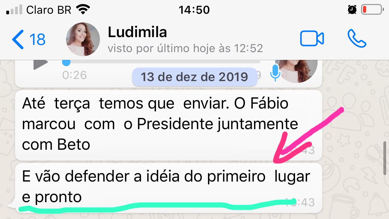 Ludimilla sempre foi uma das cotadas para estar entre os três primeiros colocados e o print abaixo mostra que em dezembro do ano passado ela já vinha mantendo contatos com membros da bancada federal como os deputados Beto Rosado (PP) – seu ex-aluno-, General Girão (PSL) e Benes Leocádio (Republicanos). Em 12 de dezembro de 2019 a confiança era de que ela venceria a eleição.