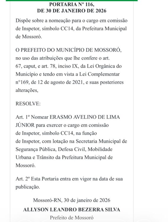 Erasmo Avelino de Lima Junior foi nomeado em 30 de janeiro pelo prefeito Allyson Bezerra (UB) para o cargo de inspetor com lotação na Secretaria Municipal de Segurança Pública, Defesa Civil, Mobilidade Urbana e Trânsito.