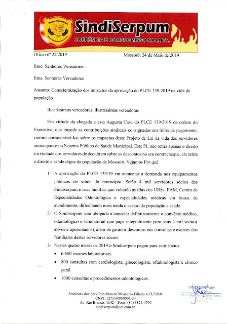 Por meio de ofício encaminhado aos gabinetes dos vereadores o Sindicato dos Servidores Públicos Municipais de Mossoró (Sindserpum) está informando que 4 mil trabalhadores podem ficar sem seus respectivos planos de saúde caso seja aprovado o Projeto de Lei Complementar 139 que revoga a cobrança da contribuição sindical descontada em contracheque.