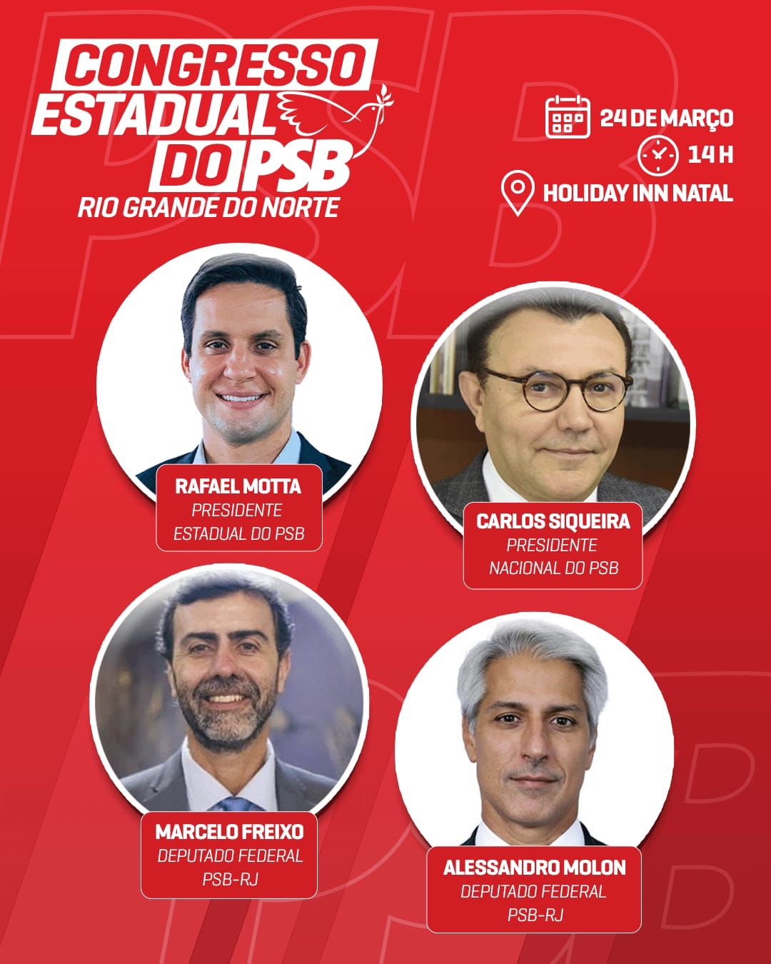 O Congresso será comandado pelo presidente estadual do PSB, o deputado federal Rafael Motta. Já confirmaram presença o presidente nacional da legenda, Carlos Siqueira; o deputado federal e pré-candidato ao governo do RJ, Marcelo Freixo; e o deputado federal e pré-candidato ao Senado também pelo RJ, Alessandro Molon.