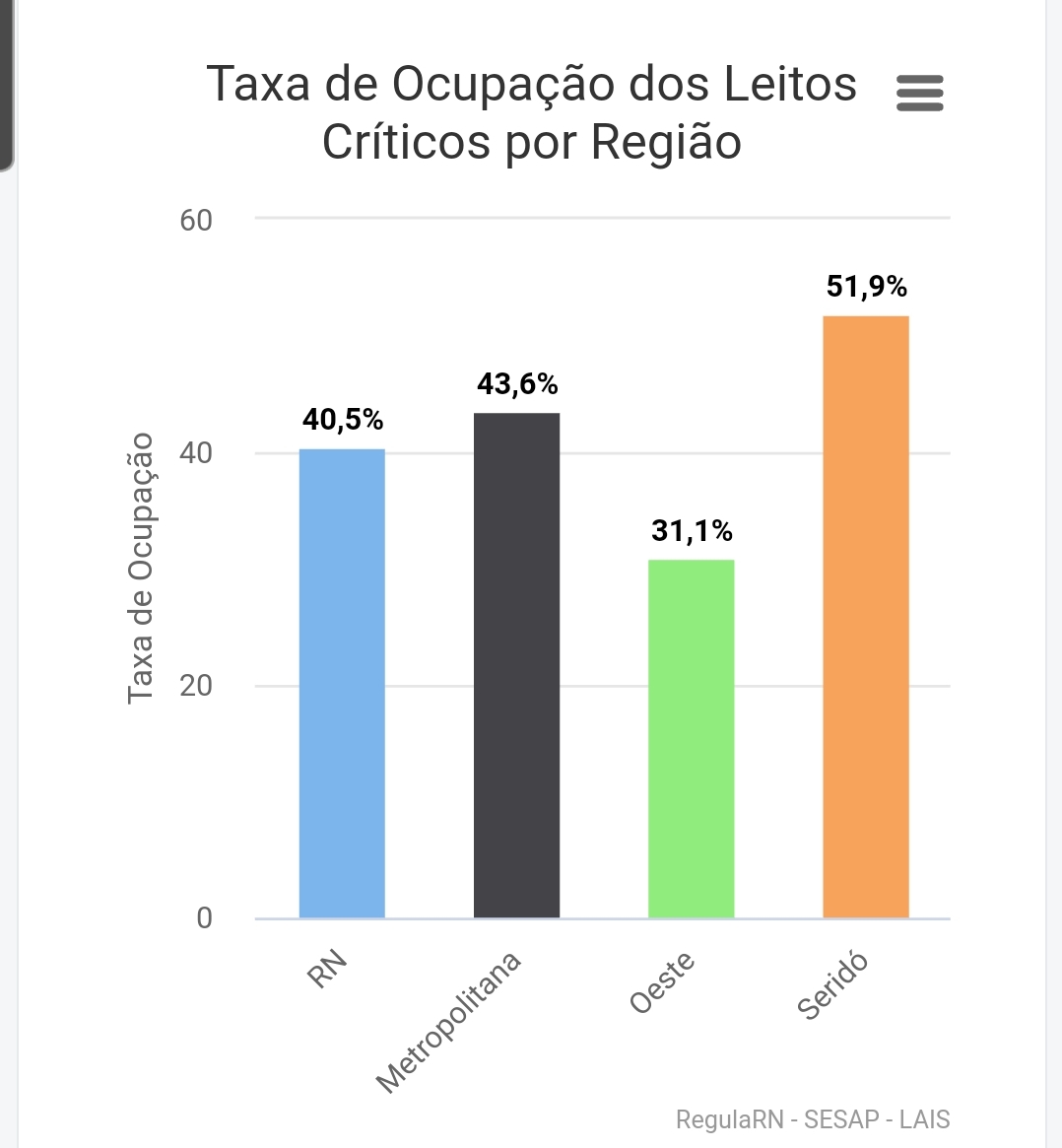 No RN a ocupação de leitos críticos é de 40,5%.
