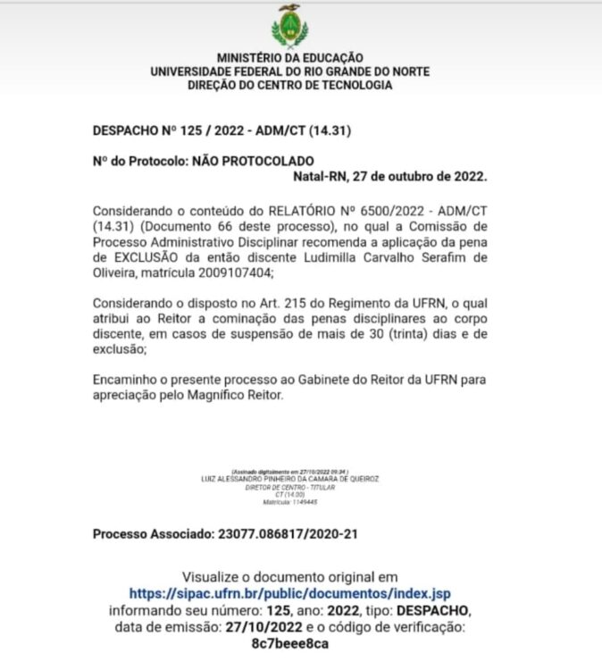 O despacho da CPAD enviado ao reitor José Daniel Diniz Melo recomenda a aplicação da pena de exclusão de Ludimilla Oliveira da condição de discente do doutorado. Cabe a ele analisar e dar a palavra final sobre o caso seguindo o artigo 215 do Regimento Interno da UFRN cuja redação é: