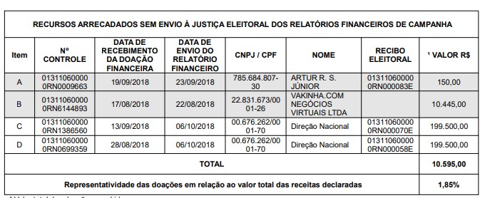 A primeira irregularidade apontada pelo documento aponta que houve descumprimento quanto à entrega dos relatórios financeiros de campanha no prazo estabelecido pela legislação eleitoral, em relação às seguintes doações (art. 50, I, da Resolução TSE nº 23.553/2017).