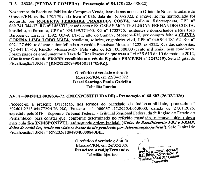 Como as alterações burocráticas não foram feitas pelo casal, no cartório (1º Ofício de Notas) consta apenas a transação de terreno. O imóvel neste momento está bloqueado pela justiça tendo em vista que Roberta também é sócia da Dismed e é um dos alvos da Operação Mederi realizada no dia 27 de janeiro.