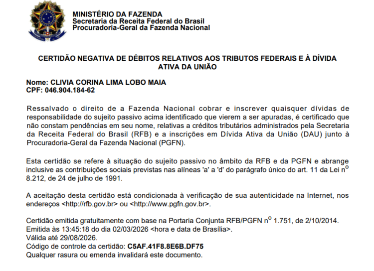 Ela também apresentou uma certidão de nada consta na Receita Federal.