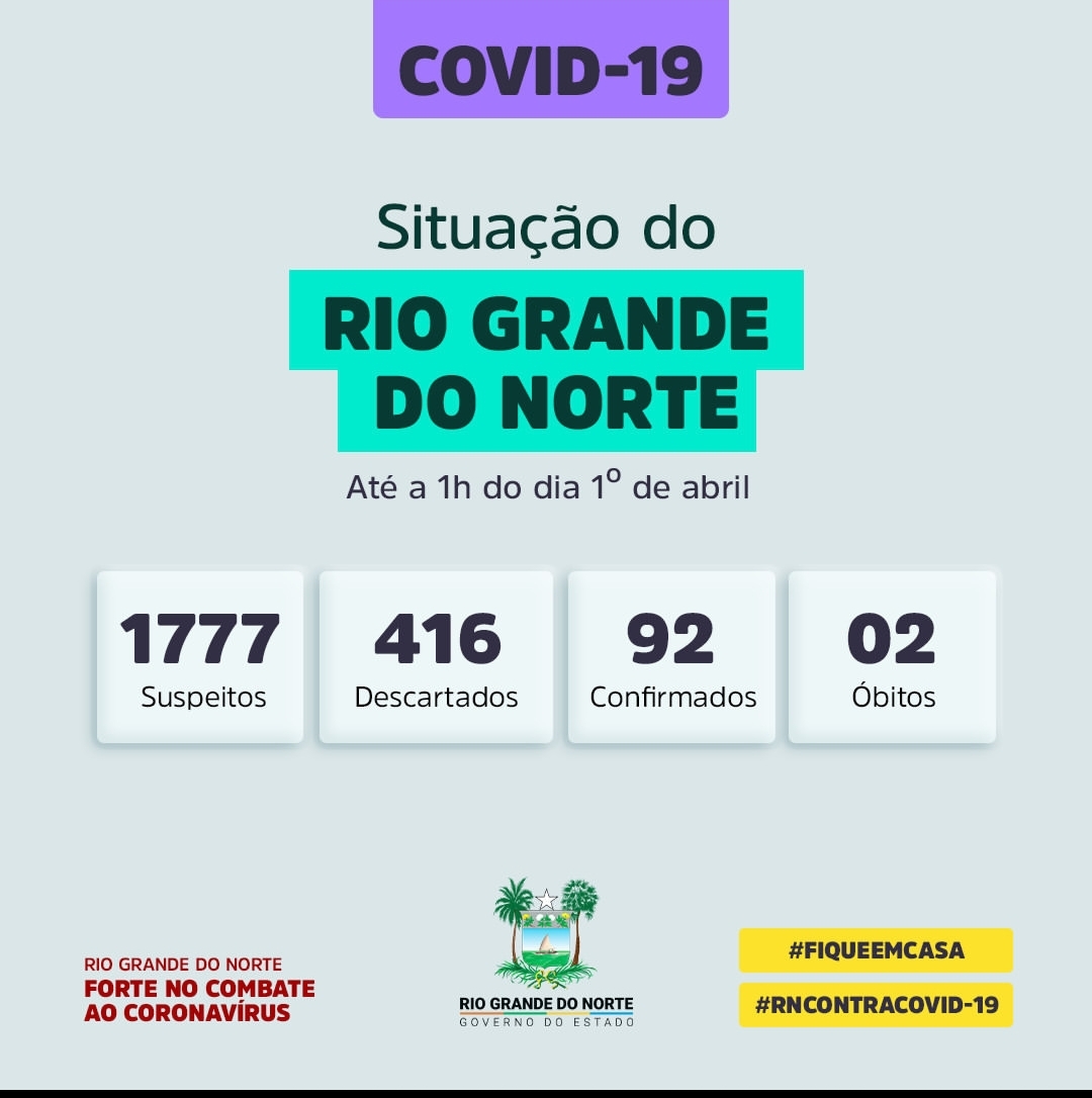 O boletim da Secretaria Estadual de Saúde Pública informa que o Rio Grande do Norte agora 92 casos confirmados de pessoas com o novo coronavírus.