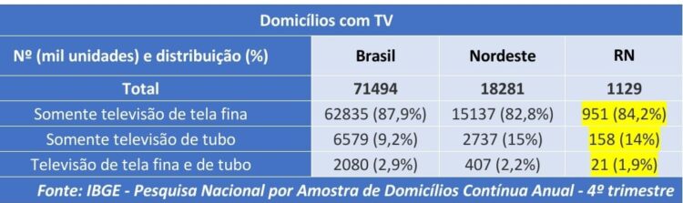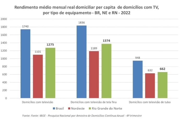 Considerando ainda os domicílios com televisão no Rio Grande do Norte em 2022, 279 mil ou 24,7% tinham acesso a serviço de televisão por assinatura. Dos 851 mil domicílios sem esse acesso (75,3%), mais de 50% (430 mil) disseram ter falta de interesse no serviço, enquanto 41,2% (350 mil) disseram não ter o serviço por ser caro. Quanto ao serviço pago de streaming de vídeo, 391 mil ou 34,6% possuíam acesso ao serviço. O rendimento médio mensal real domiciliar per capita dos 1,1 milhão de domicílios potiguares em 2022 onde havia televisão foi de R$ 1275, sendo R$ 1374 naqueles com televisão de tela fina e de R$ 662 naqueles em que havia as de tubo. No Brasil, a média do rendimento dos domicílios foi de R$ 1740 para domicílios com televisão, sendo R$ 1836 nos que tinham as de tela fina e R$ 948 onde havia as de tubo.